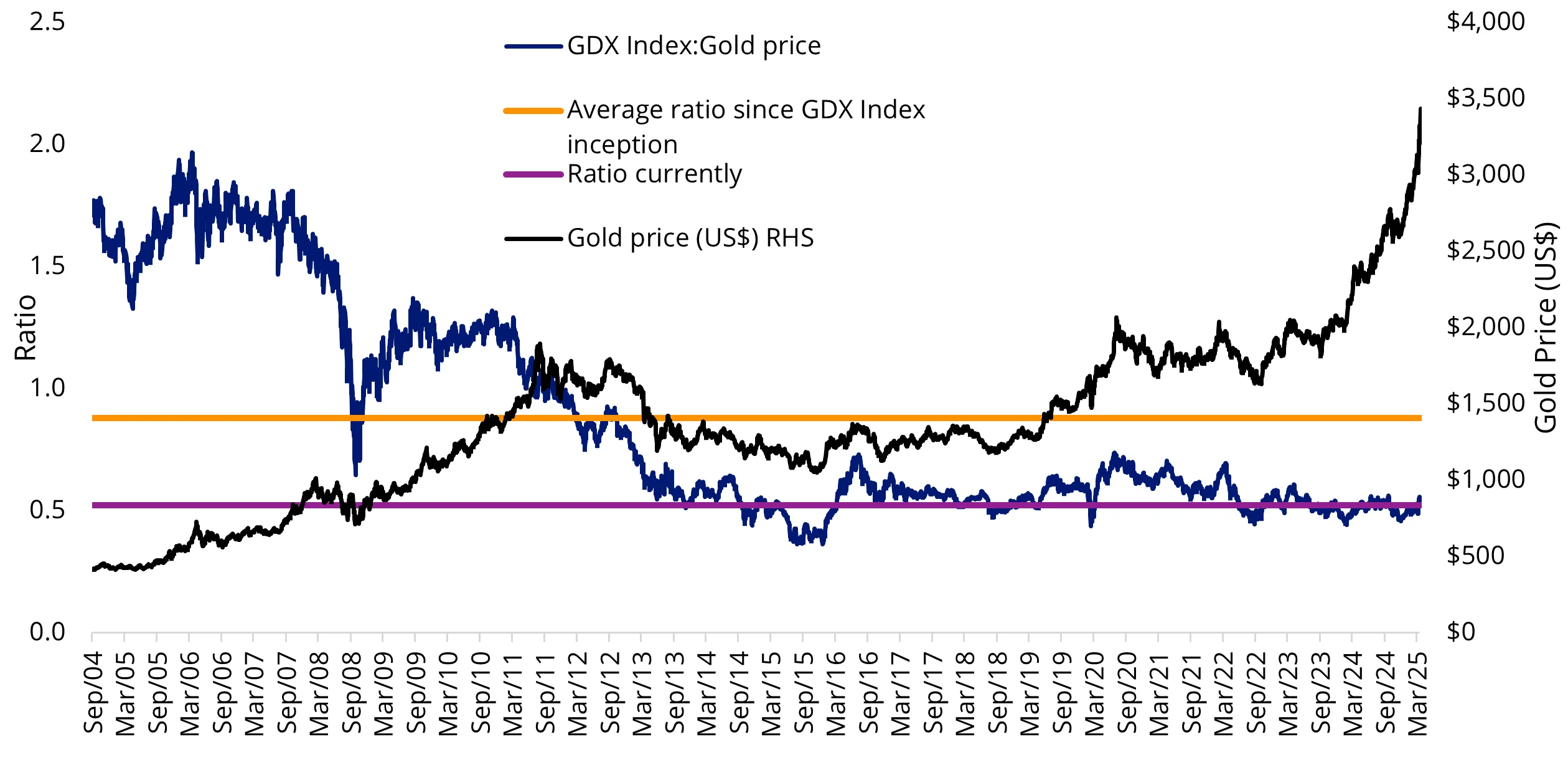 Source: VanEck, LBMA. Bloomberg, as at 29 April 2025. All figures in US dollars. Past performance is not a reliable indicator of future performance. There is no guarantee that gold miners, as represented by the GDX Index will return to the long-term average ratio. You cannot invest in an index.