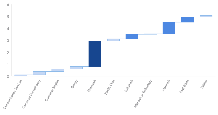 MVW’s more broad exposure to the Australian economy means that it is less dependent on the financial sector to maintain its dividend yield. You can see from the below the more diversified equal weight portfolio is far less reliant on financials that the S&P/ASX 200 portfolio which gets around 45% of its dividends from financials.