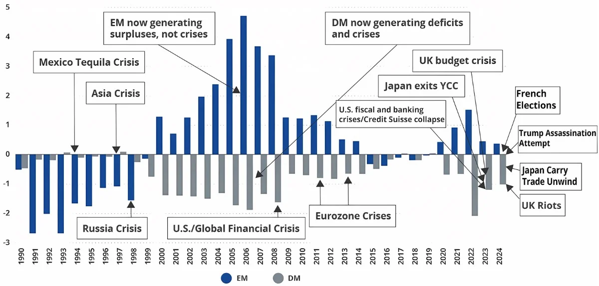 This has coincided with the rising incidents of crises stemming from DMs. Since the turn of the century, DMs have been responsible for every major market crises.