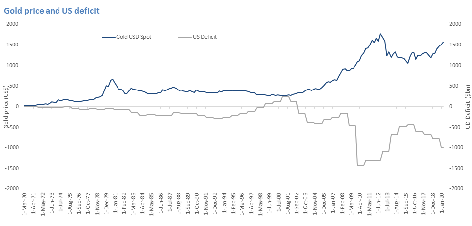 While central banks have been stimulating the economy with expansionary policies, so too governments have been pumping money into the economy. Historically, gold has a negative correlation to the US deficit, as can be seen in the chart below.