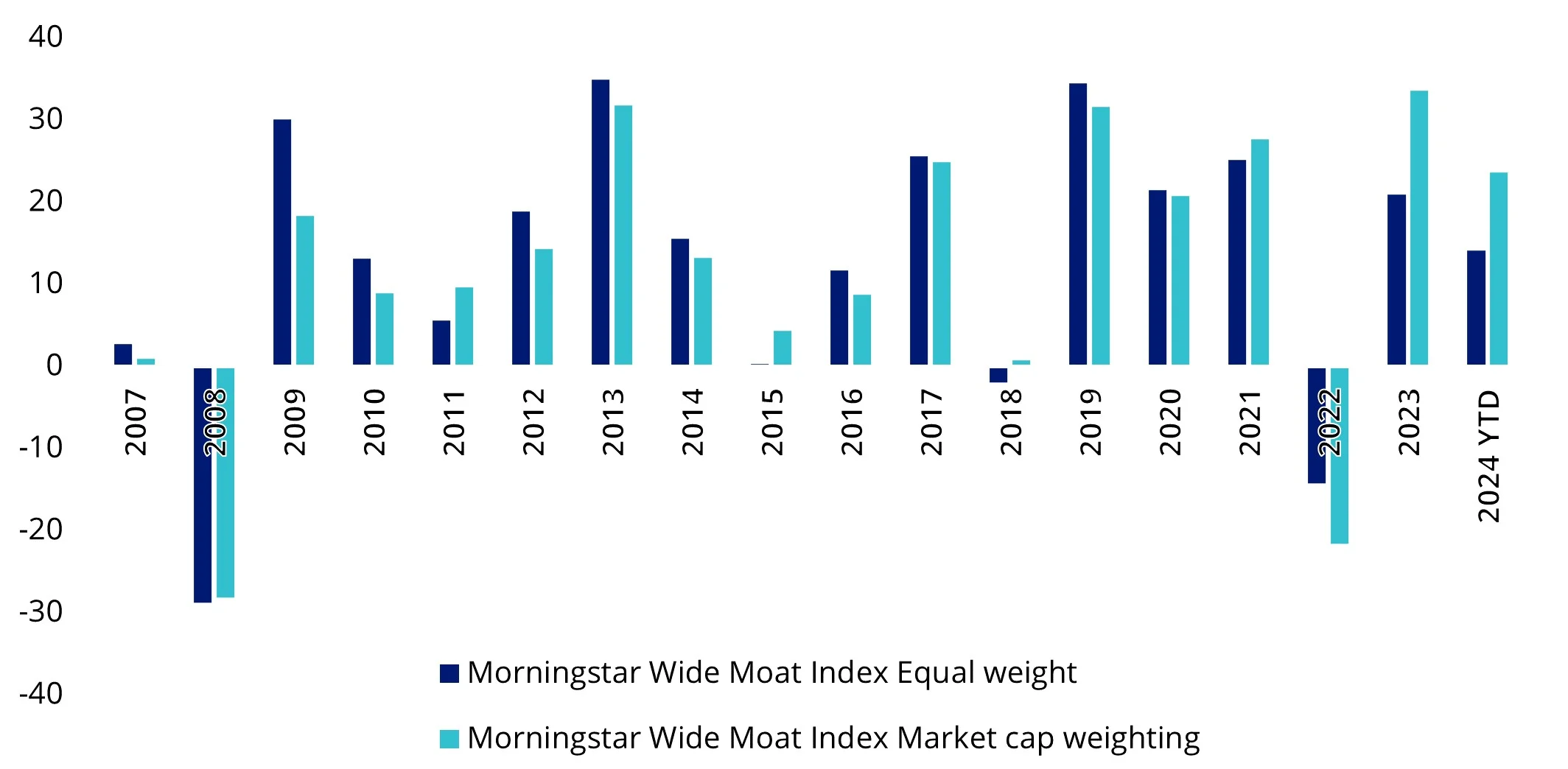 The impetus for this research was the outsized valuations of the so called ‘Magnificent 7’, and their impact on the performance of active and passive international equity funds that include these companies. The Magnificent 7’s AI-fuelled momentum throughout 2023 and 2024 has benefited investors with more exposure to these stocks. MOAT’s equal weight approach means its exposure to this growth was limited. Despite this, it found the MOAT Index outperformed over the long term compared to the market cap index, leading to outperformance in 11 of the 18 calendar years that it has been running.