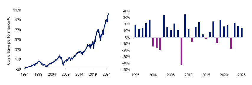 Source: VanEck. Bloomberg. MSCI ACWI Net Total Return Index. Performance in USD. Date from 31 December 1994 to 25 August 2025. You can not buy an index. Past performance is not indicative of future performance.
